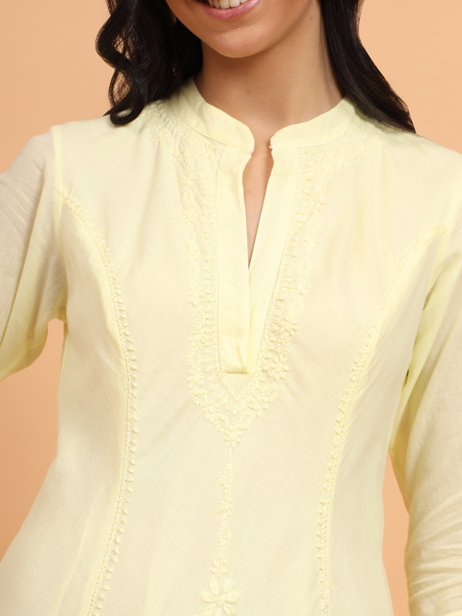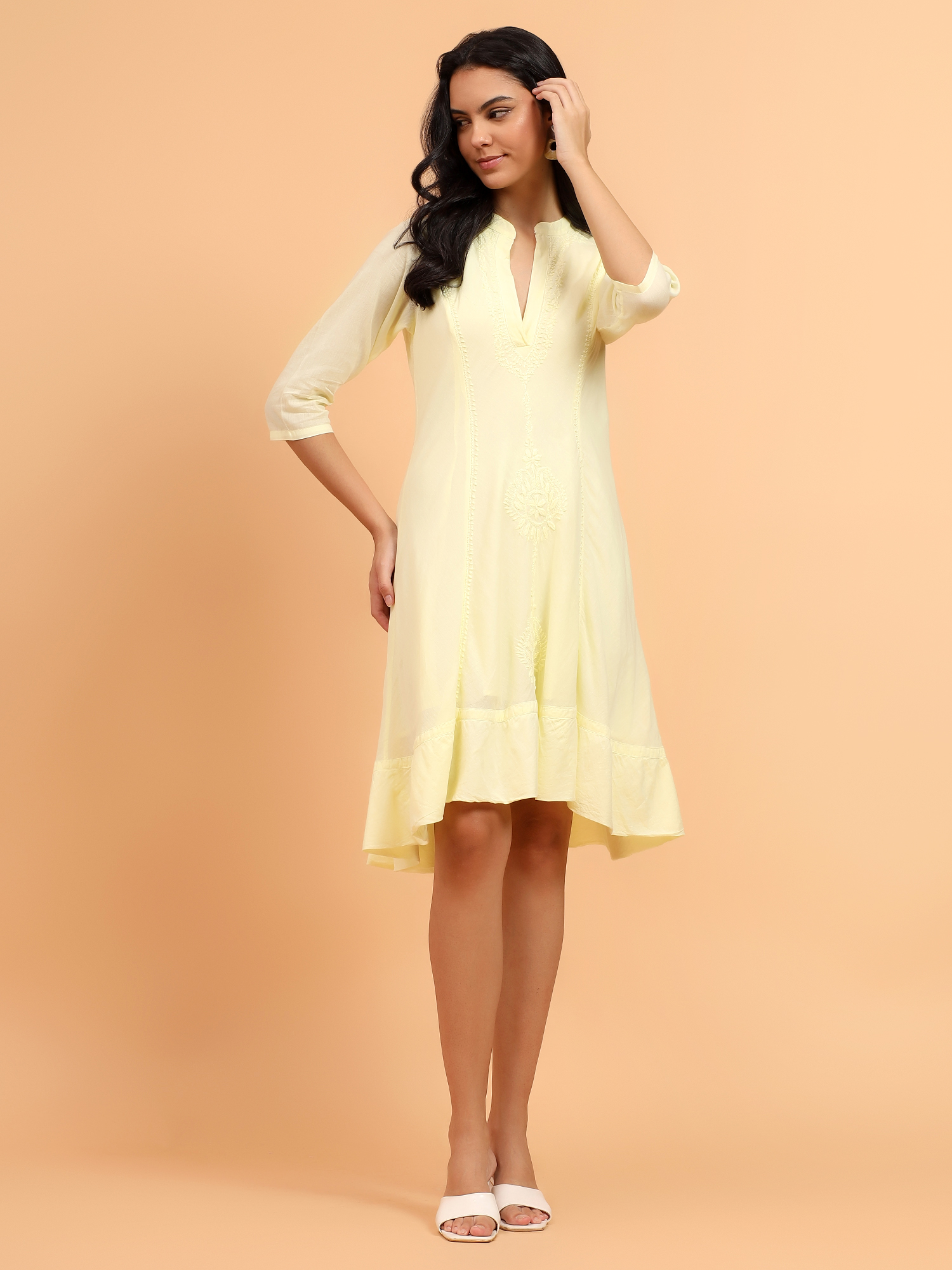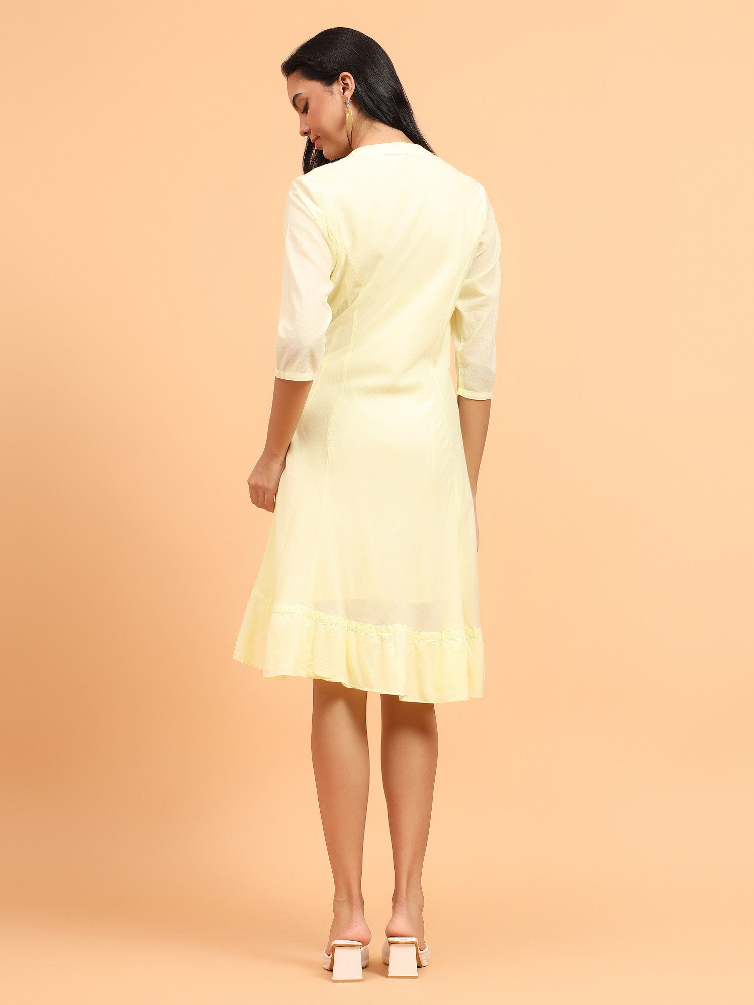 Bright, cheerful, and graceful – this lemon-yellow dress is your sunshine outfit for the season. Crafted in a breathable fabric, it features a flattering A-line silhouette with a soft flare and ruffled hem that adds playful movement. The notch neckline and 3/4th sleeves give it a refined touch, while delicate tonal embroidery brings subtle handcrafted detailing. Whether it’s a casual brunch, a festive get-together, or a day out, this dress is designed to keep you looking stylish and feeling comfortable.