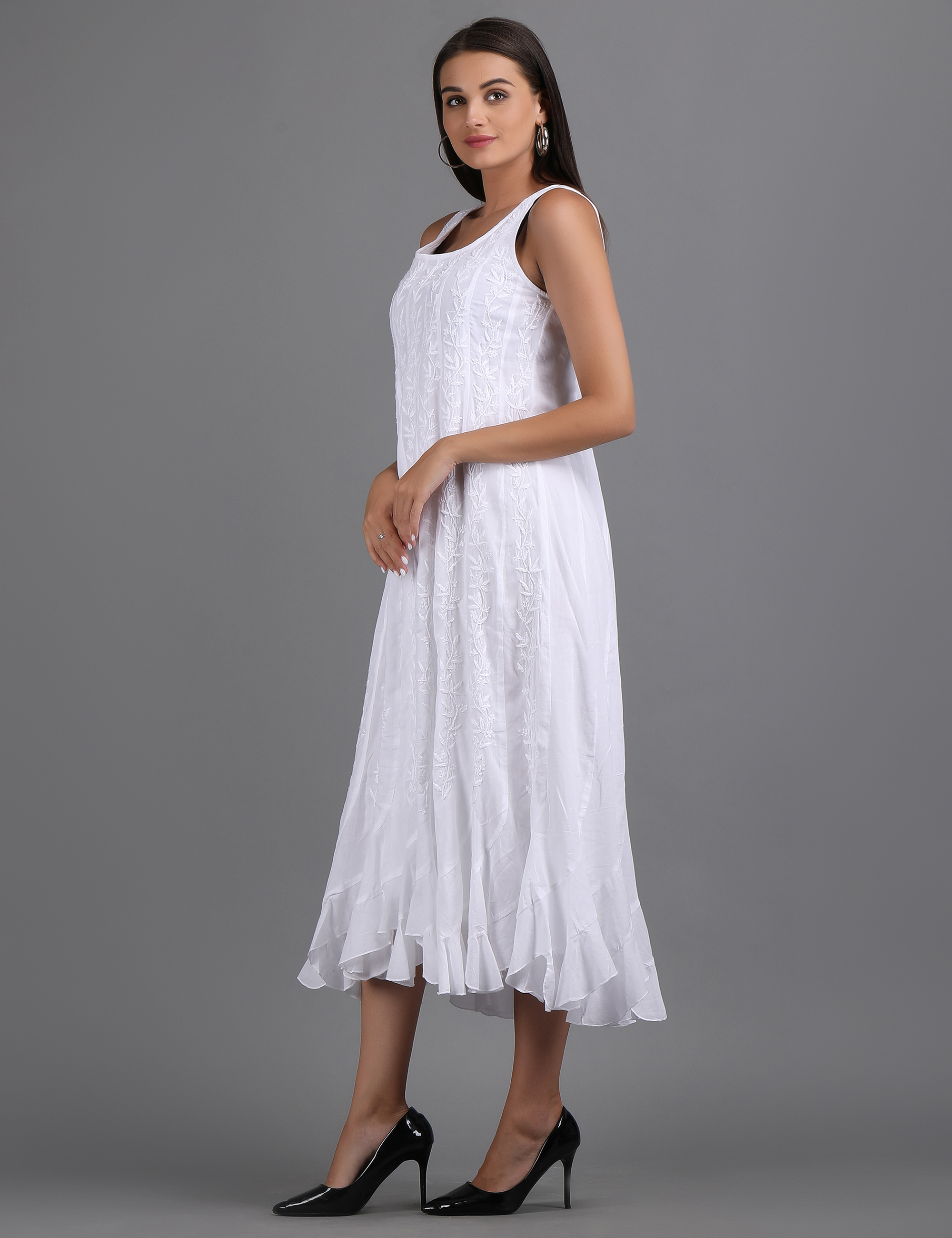 Turn heads in this breezy embroidered sleeveless maxi dress, designed for elegance and comfort. With its delicate embroidery, soft flare, and flowy hemline, it’s the perfect blend of chic and effortless style. Available in White, Pink & Lime, this dress is your go-to for brunches, vacations, or evening outings.