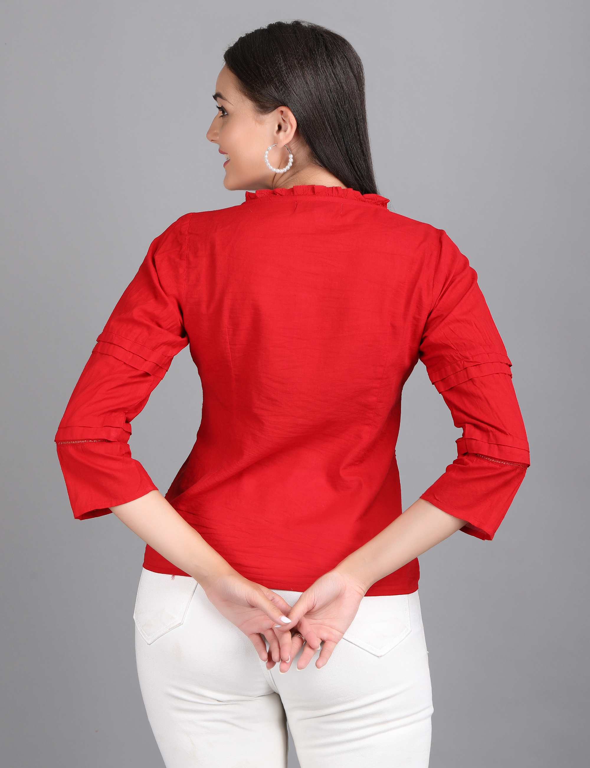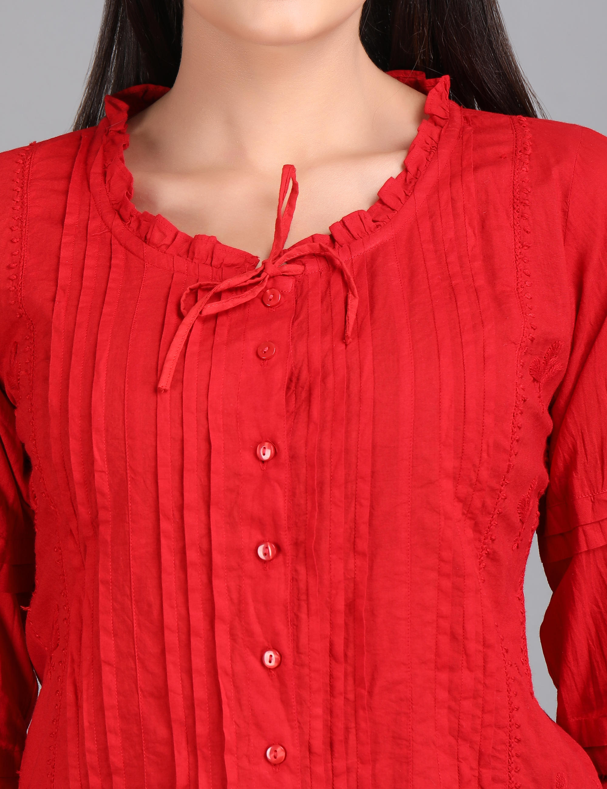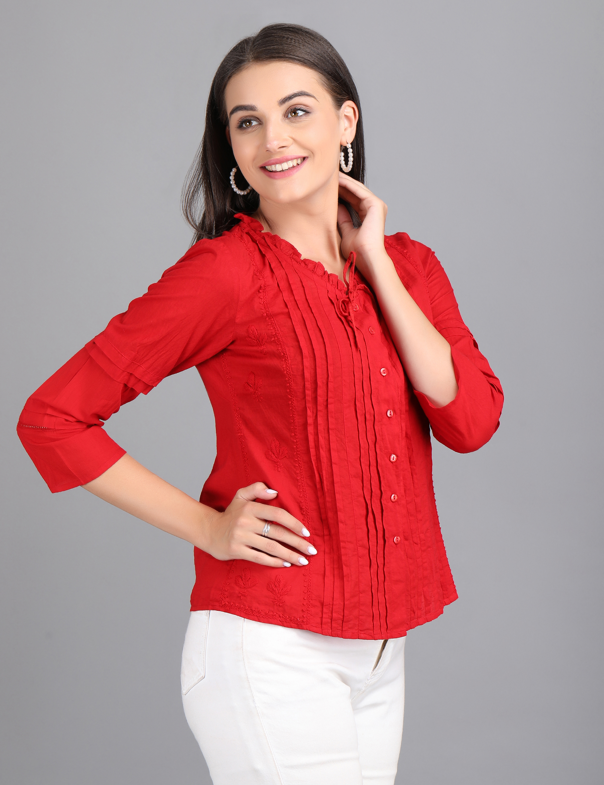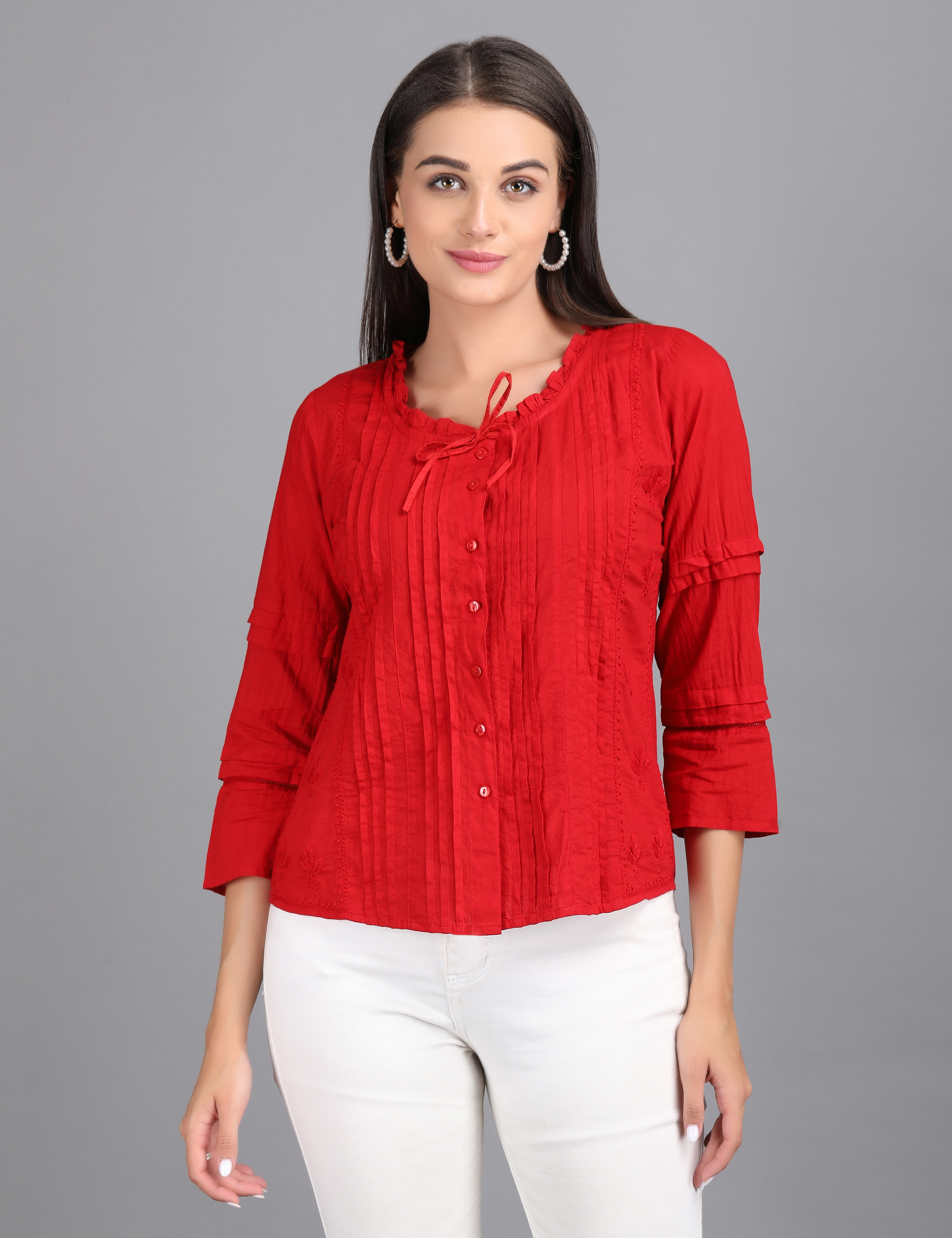 Elevate your everyday style with our Crimson Charm Top, designed to blend sophistication with comfort. Featuring a button-down front, soft pleats, and a delicate tie-up neckline, this piece adds just the right amount of elegance to your wardrobe. The 3/4th sleeves with subtle detailing make it versatile enough for work, casual outings, or evening get-togethers.