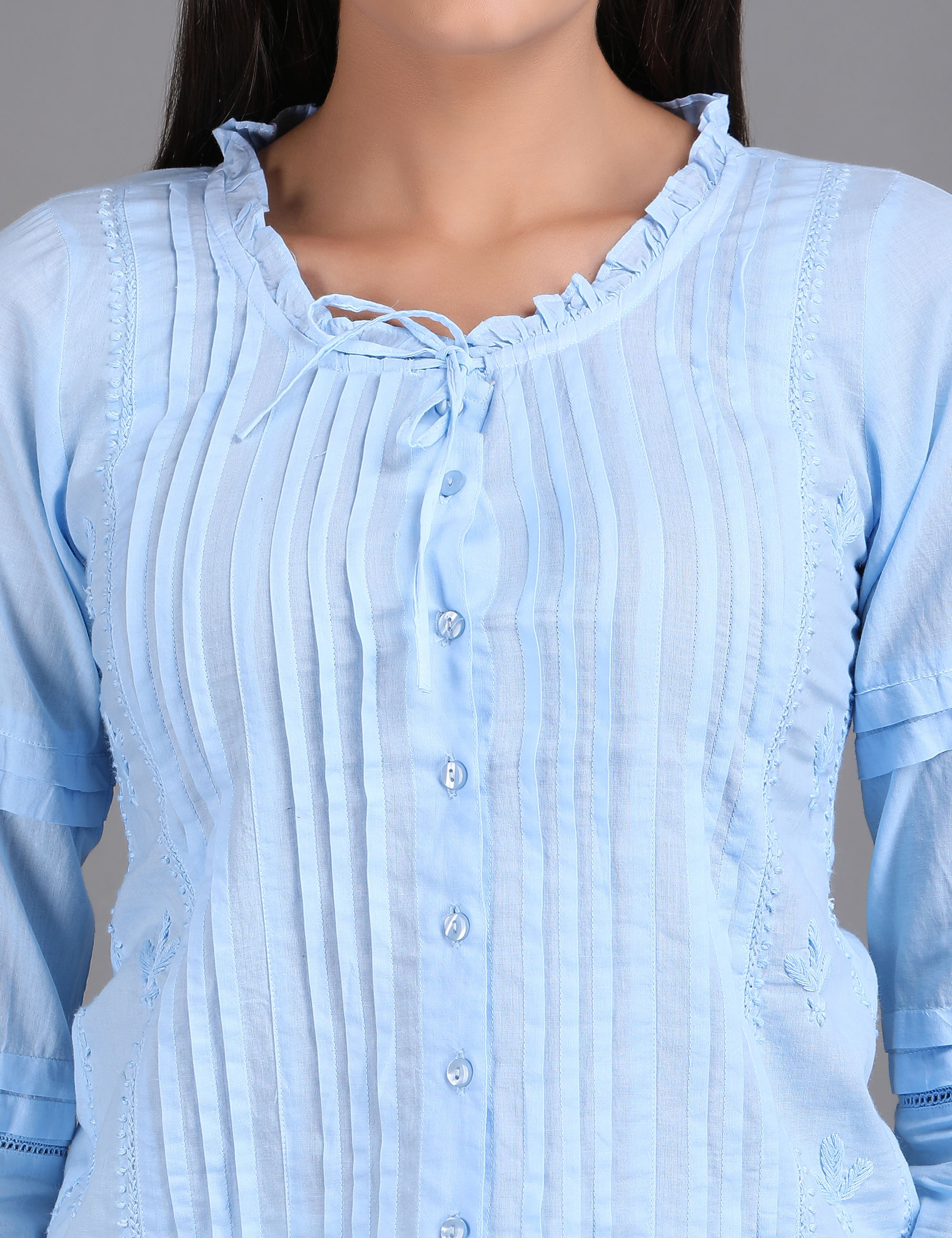Neckline: Ruffled round neck with tie-up detail