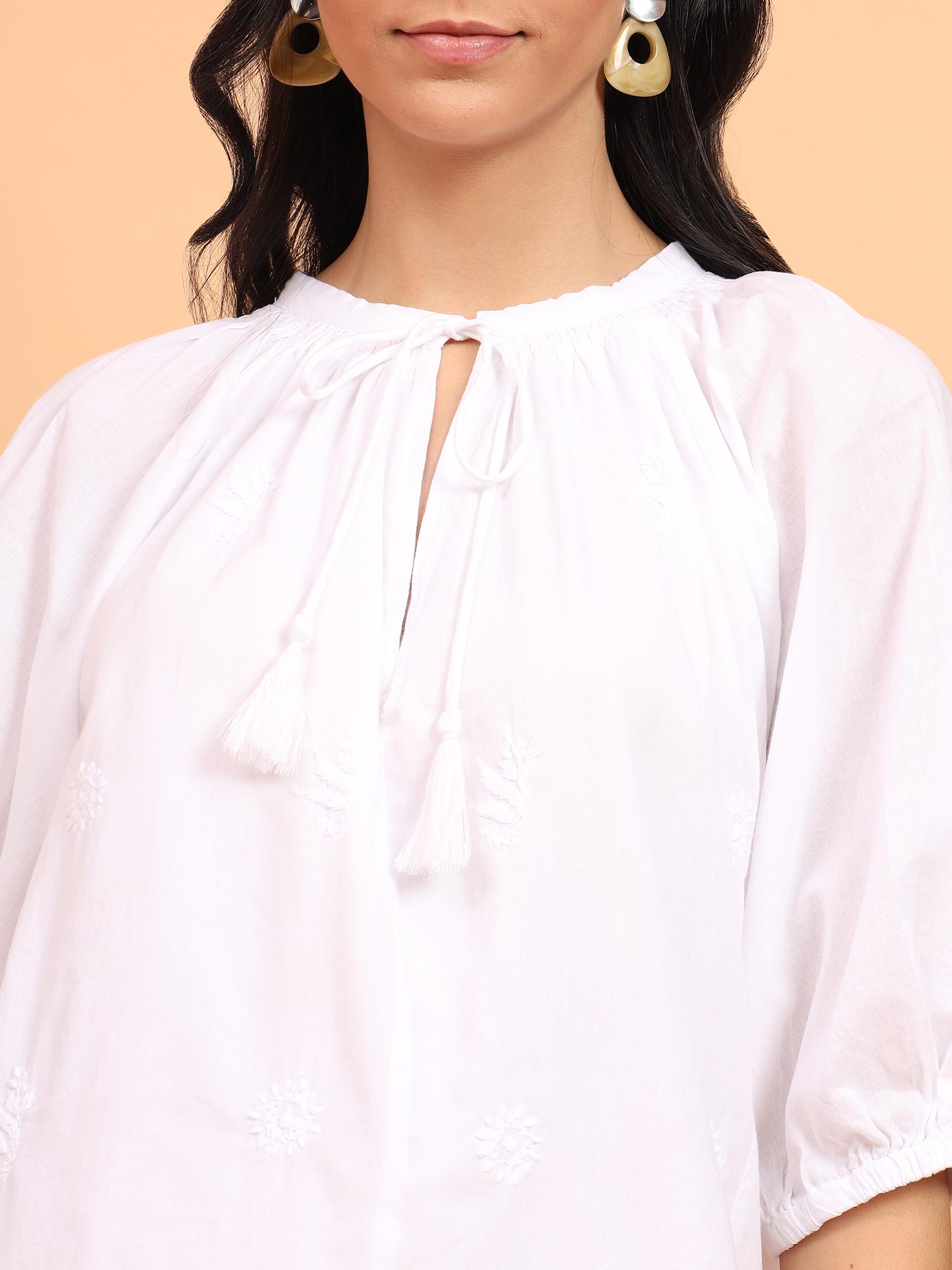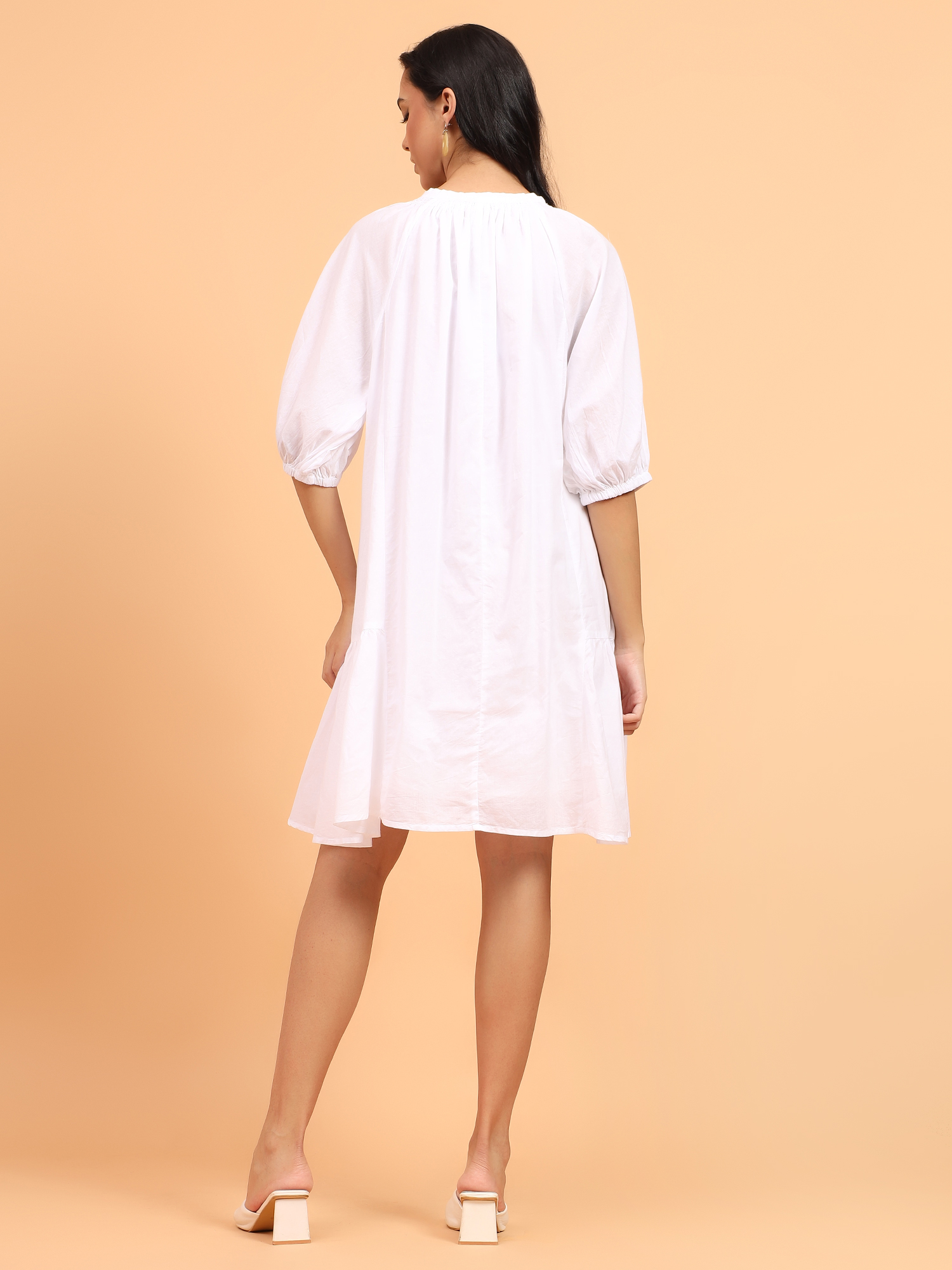 Embrace timeless elegance with our White Embroidered A-Line Dress. Designed with a relaxed silhouette, this dress features delicate tonal embroidery that adds subtle charm to its minimal look. The round neckline with tie-up detail gives it a playful touch, while the elbow-length puff sleeves bring a hint of sophistication.